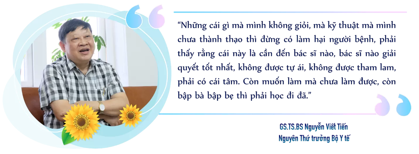 Bằng cái tâm với nghề, GS.TS Nguyễn Viết Tiến cho thấy cái tầm của một người bác sĩ mẫu mực, như lời Chủ tịch Hồ Chí Minh căn dặn: "Cán bộ cần phải thương yêu, săn sóc người bệnh như anh em, ruột thịt của mình, coi họ đau đớn cũng như mình đau đớn."